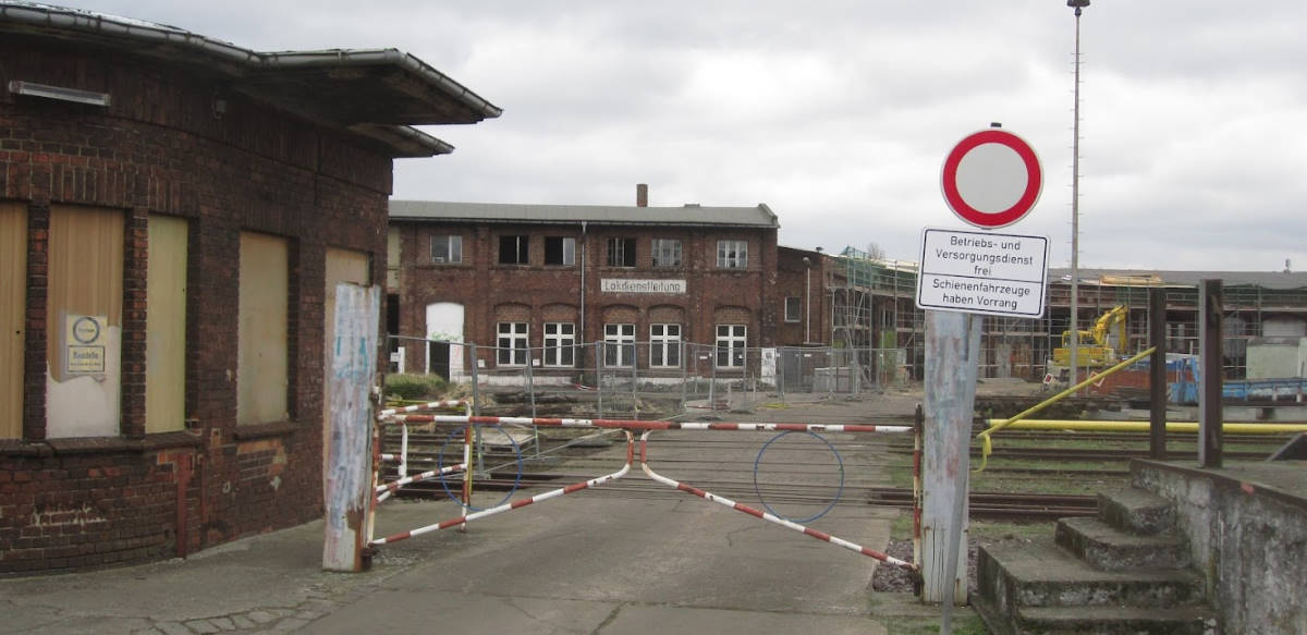View of the former Magdeburg side of the station. This is where the trains went to and from the south until 1999. Today, our driver's cab rides take place here. A track-laying machine is also on display. The wasteland next to it has recently been revitalised by a road and a shopping centre.