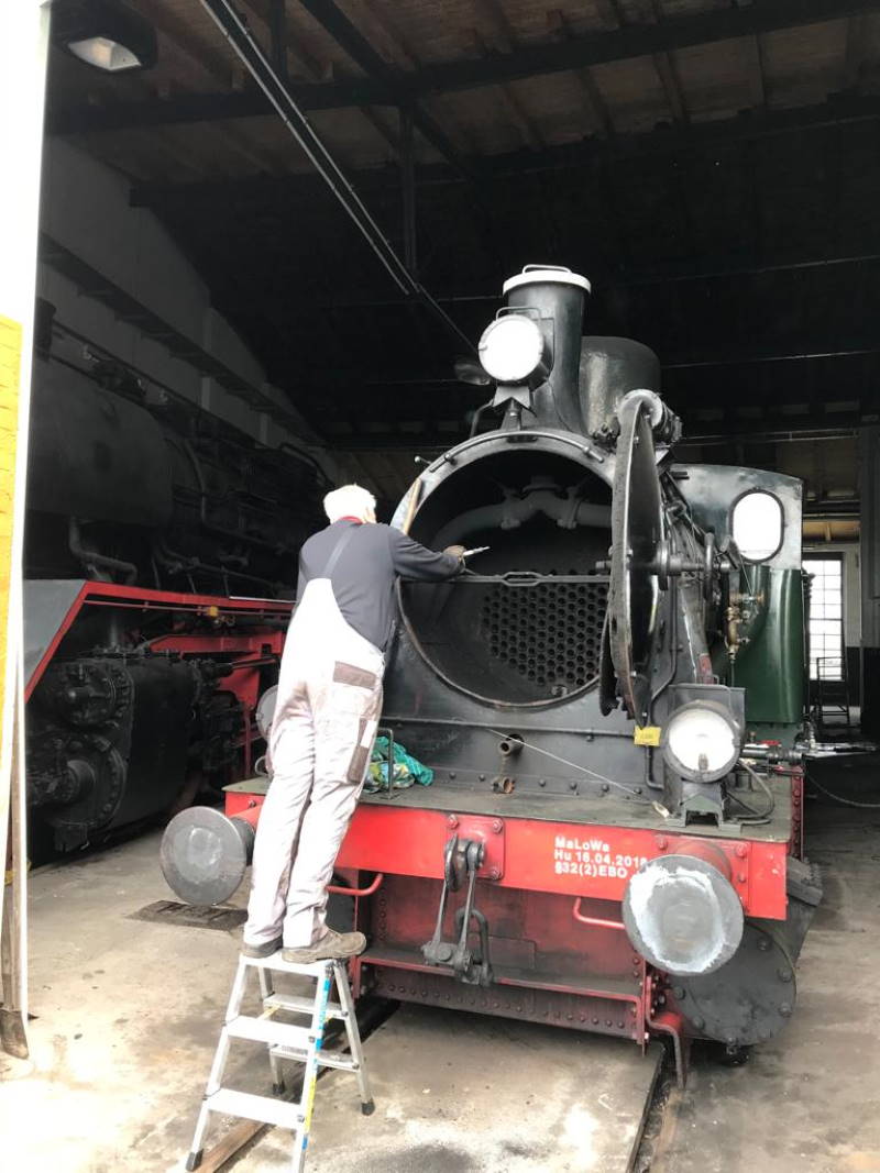 Our steam locomotive Emma is also being awakened from hibernation. After washing out the boiler, the washing hatches were put back in place and the pipes leading from the firebox into the smokebox were cleaned of ash and soot.