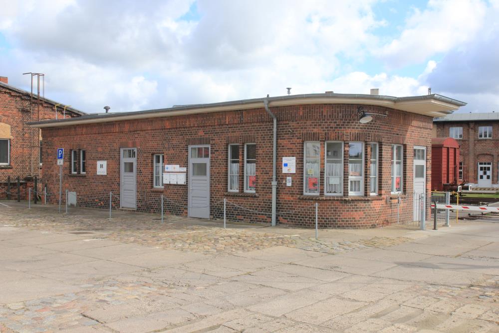 Das Pförtnergebäude am Eingang zum ehemaligen Bahnbetriebswerk (Bw) Wittenberge. Hier wachten strenge Herrschaften darüber, dass kein Betriebsfremder das Gleisgelände betrat. Das war insbesondere zu DDR-Zeiten als besonders wichtig eingestuft, weil Lokomotiven des Bw Wittenberge Reisezüge ins „Nicht-sozialistische Ausland“, sprich die BRD und West-Berlin, beförderten und die dafür benötigten Anlagen als sicherheitssensibel angesehen wurden.