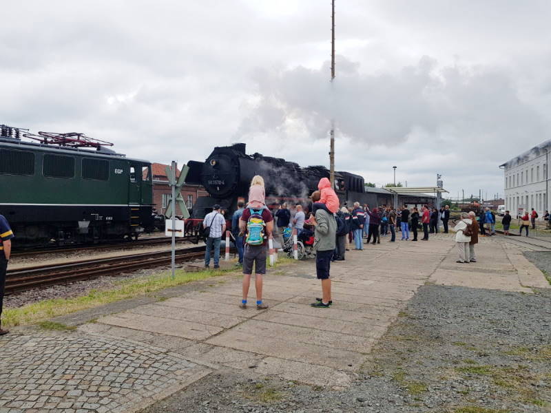 But one thing at a time: On the Friday before the event, the vehicles were arranged as usual, the steam locomotives were fired up and this time the necessary ground markings and guidance systems were also installed in order to organize a regulated visitor traffic with sodial distancing. In addition, 50 3570 was sent to the port of Wittenberge for a trial run to see if the work we had carried out on the runnung gear recently had been successful. The trip was completed without incident and the following photo shows the locomotive on its way to the harbour
