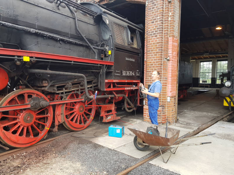 Inzwischen standen mal wieder einige Wartungs- und Pflegearbeiten an unseren betriebsfähigen Dampfloks an. So waren bei der Dampflok 50 3570 einige Löcher im Aschkasten zu stopfen. Also hat sich der fleißige Kollege heldenhaft ins Innere der Lok begeben und hat die Löcher zugeschweißt.