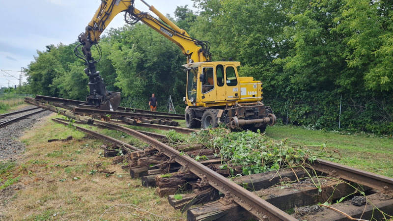 Zu guter Letzt gibt es noch zu berichten, dass wir einige Schienenlängen aus dem benachbarten Wäldchen bergen lassen konnten. Mit einem gerade anwesenden Bagger konnten die Gleisjoche aus dem dichten Bewuchs gezogen werden. Zwar sind die Schwellen verrottet. Aber die Schienen sind noch brauchbar und dienen als Grundstock für die zukünftige Wiedererrichtung des Lokschuppens 1.