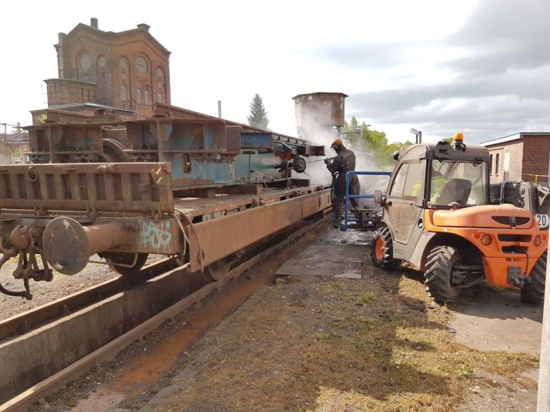 We have already reported elsewhere that the turntable in front of former loco shed 1 was scrapped at the end of the 1990s and the turntable pit filled in. Since it is the long-term goal of the society to reinstall this facility, the first steps have already been taken. Thus we were able to acquire a turntable deck from Parchim, which is to be installed in the turntable pit of locomotive shed 1, which can be reopened as it is the right length. Now the deck has been cleaned of old paint and rust by a specialist company using a high-pressure water jet and primed. The parts can now be examined, although we do not foresee any major difficulties. The pictures show the cleaning work on 23.5.2017.