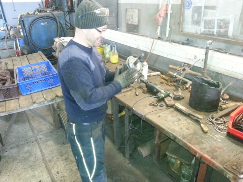 A major part of this work has been to free the inside of the boiler from lime-scale (boiler furring). To do this, all the wash-out plugs had to be removed and the boiler thoroughly cleaned. Those same 30 or so washout plugs then had to be reconditioned and replaced. Two of our members busied themselves with the refettling of the plugs today and other members screwed them back into place in the boiler.