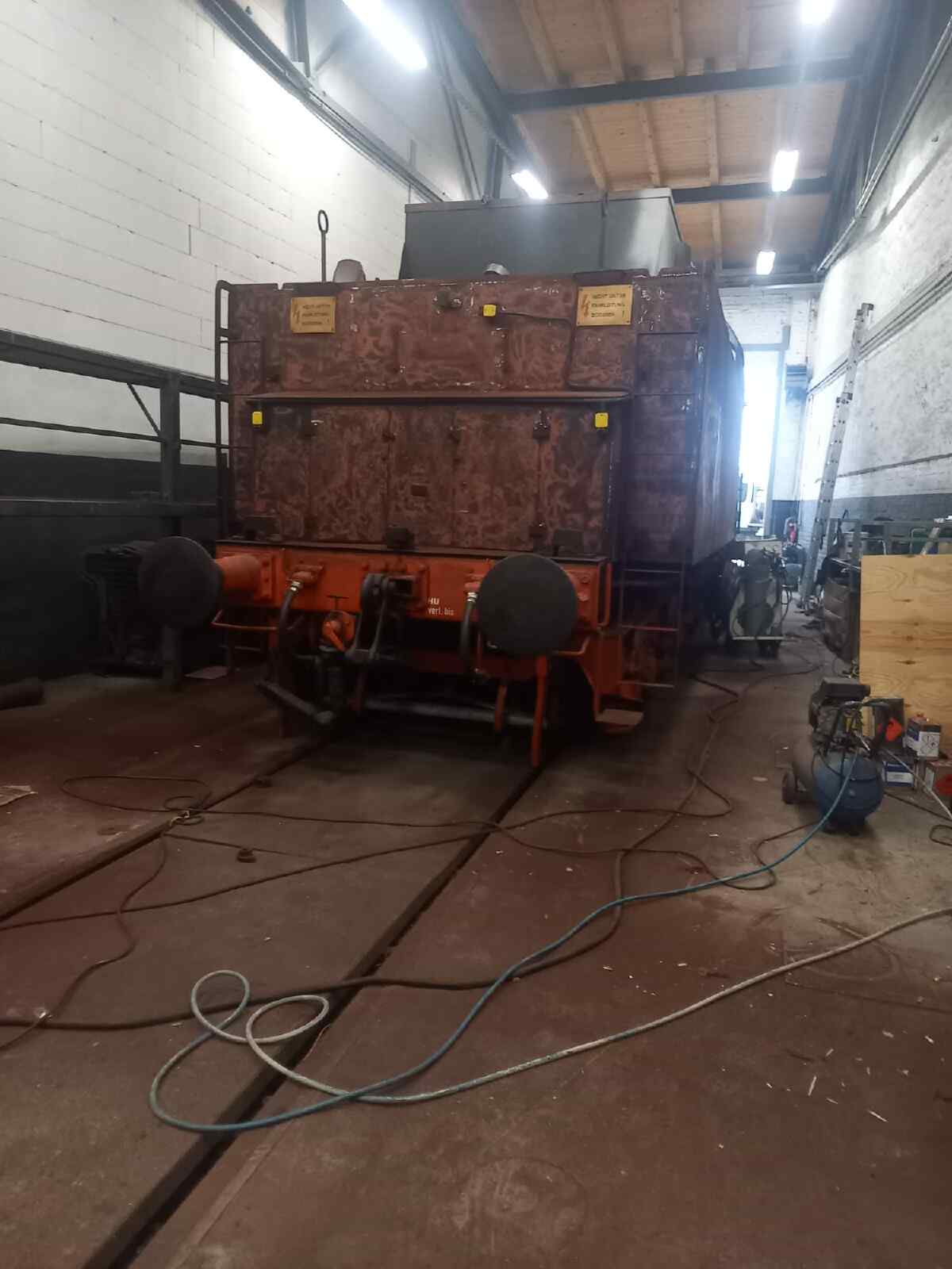 Work on the tender also continues. Now that all the metal work on the inside of the tender has been completed, we can turn our attention to coating the water tank. It has a capacity of 26 cubic metres. We applied a special paint to prevent or at least slow down further corrosion. Below is a picture of the inside of the tender. Here you can see that it has partition walls with a number of more or less large openings. These walls are intended to prevent the water inside from sloshing around too much when the locomotive accelerates or brakes.