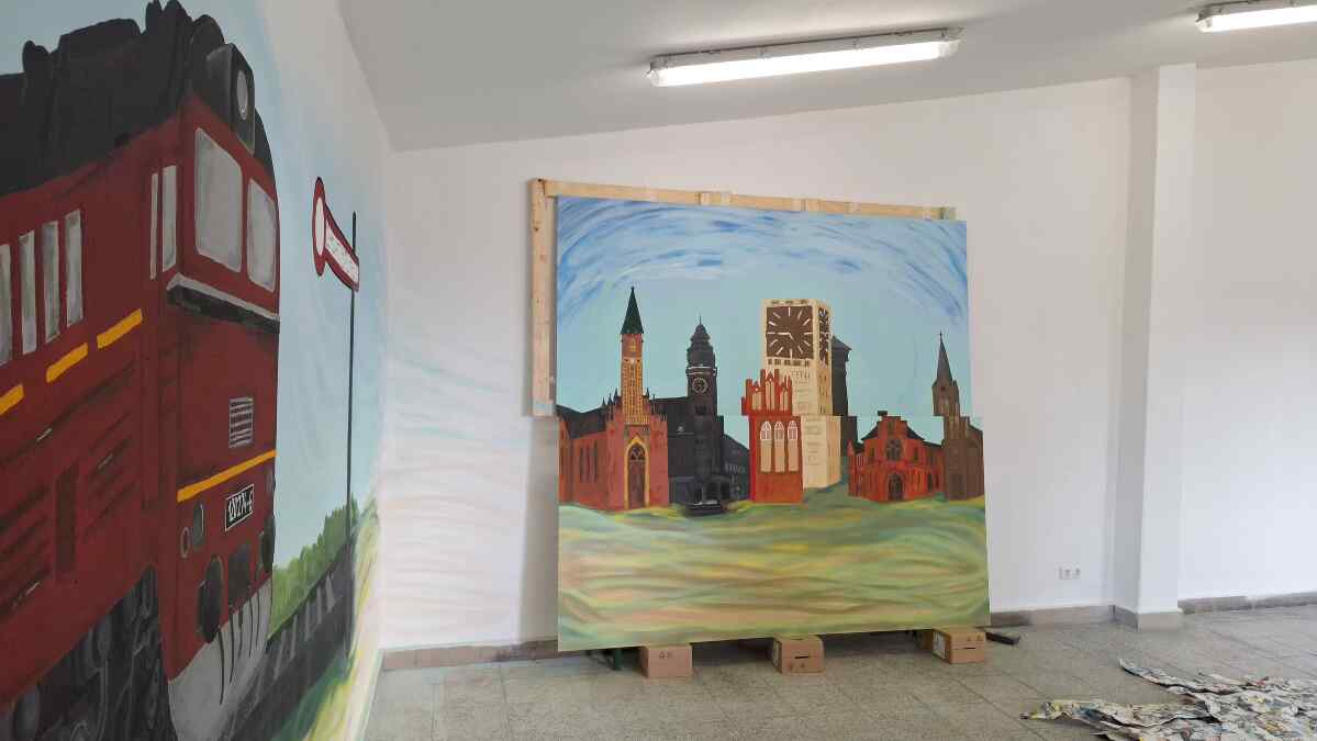 But even after the event, there is still plenty going on in the museum: a group of pupils from the Marie Curie Gymnasium are giving us a very special treat by designing some of the walls in our future exhibition space as part of an art project. They are painting railway motifs from Wittenberge on the walls based on photographs. We are thrilled and would like to say thank you for the fantastic motifs.